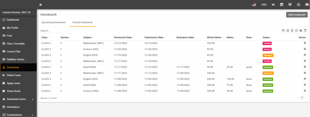 In closed homework, you can view those homework, whose Present Date and Submission Date has been passed out, submission date means as If student fails to meet the submission deadline and the homework due date has been passed, the homework would displayed in Closed Homework and another condition, if teacher does not keep Submission Date and homework present date has been passed so homework would be show in Closed Homework.