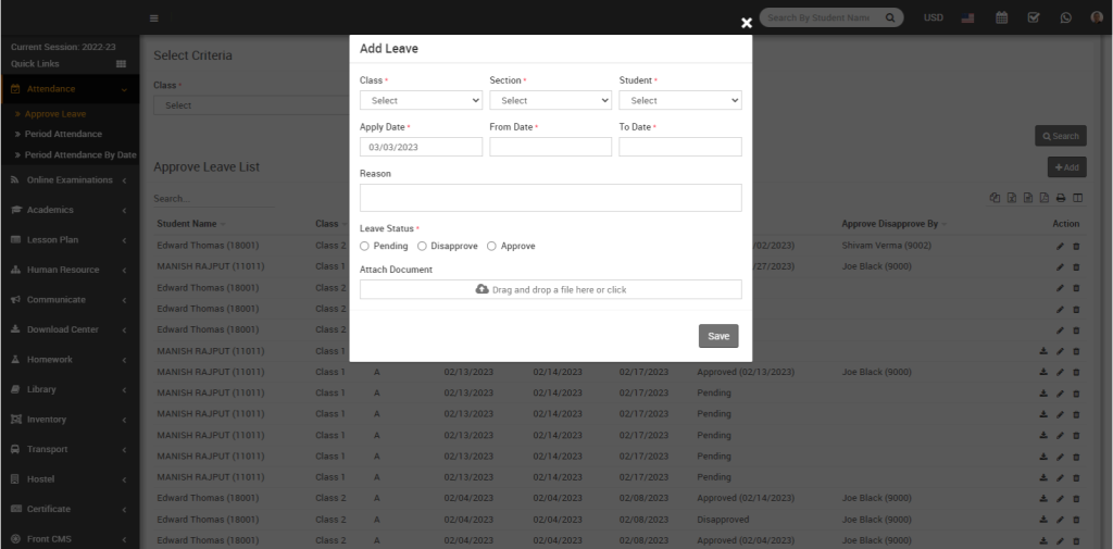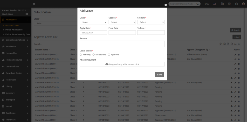Select Class, Section, and Student, then enter the Apply Date, From Date, To Date, Reason, Leave Status (Pending, Disapprove, Approve), and if needed, attach a document. After filling in the details, click on the Save button. The added record will be displayed below on the page.