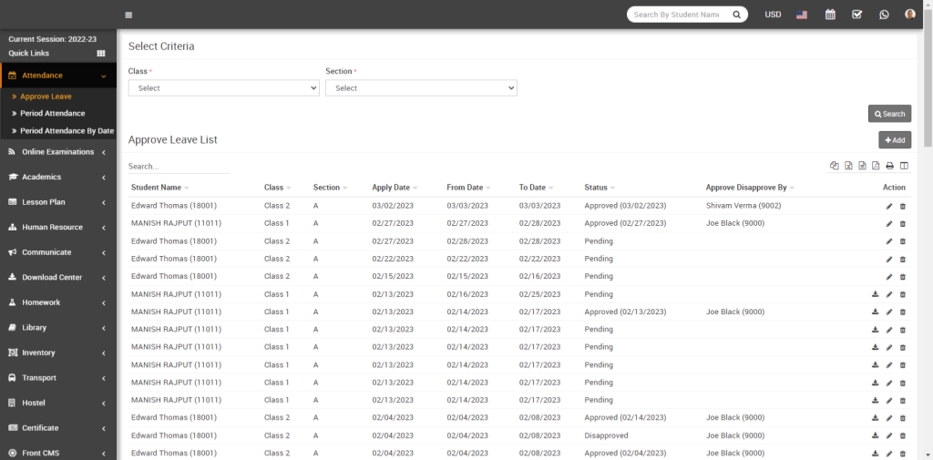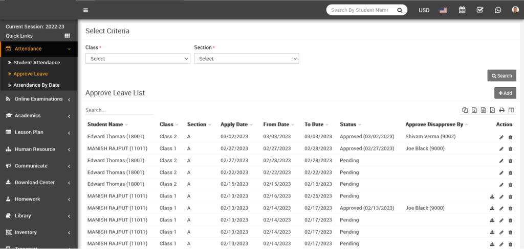 Here select Class and Section and then click on Search button. The list of approve leave will be shown in the below of the page.