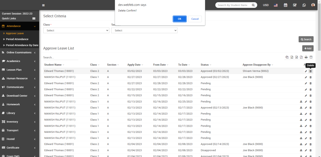 To delete the applied leave, click on the Delete icon present in the action column. When you click on it, a confirmation window for deleting appears.