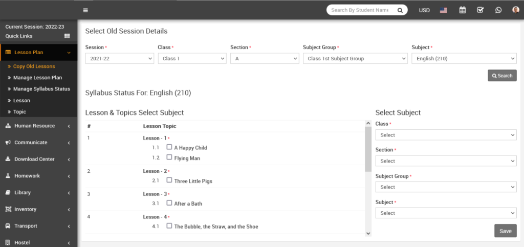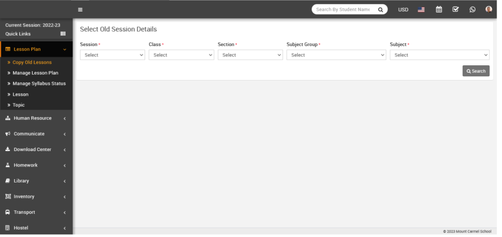 To do this, go to Lesson Plan > Copy Old Lessons, select the preferred Session, Class, Section, Subject Group, and Subject, then click the Search button.