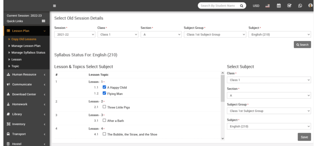 Now, select the Lesson and Topic by checking the boxes displayed on the bottom left side. On the bottom right side, select the Class, Section, Subject Group, and Subject where you want to update the Lesson Plan. Finally, click the Save button to apply the changes.