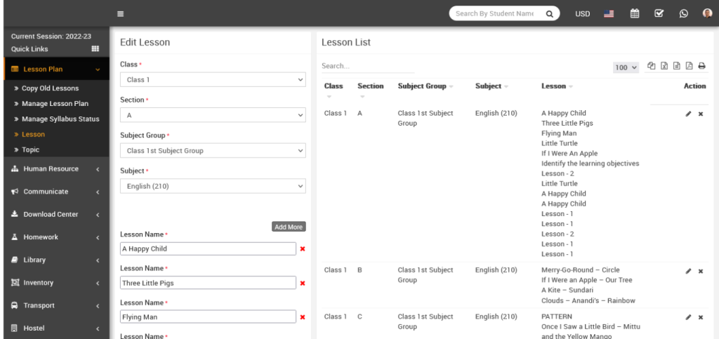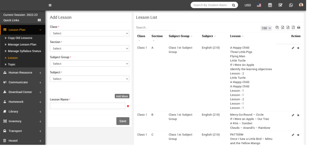 You can edit a lesson by clicking the Edit button in the Action column. The Edit Lesson window will open, where you can make the necessary changes. After updating, click the Save button to save your changes. Your lesson will be updated successfully.