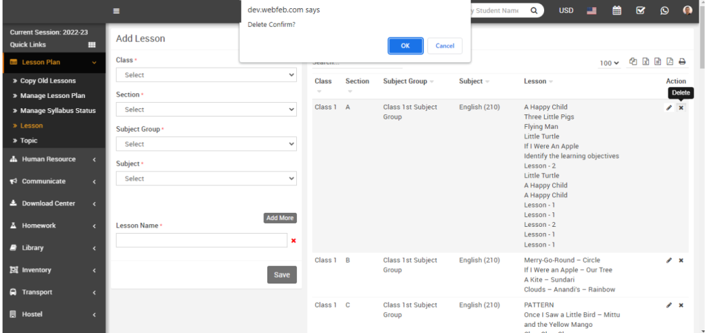 To Delete the lesson, simply click on the delete icon, confirmation model will be open.