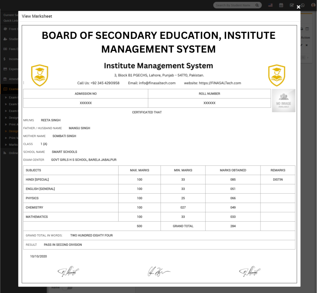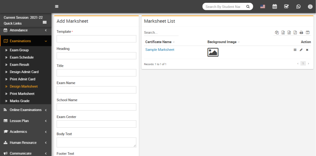 To design a marksheet, go to Examination > Design MarkSheet. Enter the details such as Template, Heading, Title, Exam Name, Institute Name, Exam Centre, Body Text, Footer Text, Printing Date, and upload the Left Logo, Right Logo, Left Sign, Middle Sign, Right Sign, and Background Image. You can also Enable/Disable fields on the marksheet. Finally, click on the Save button. The added record will be visible in the Marksheet List on the right side of the page.