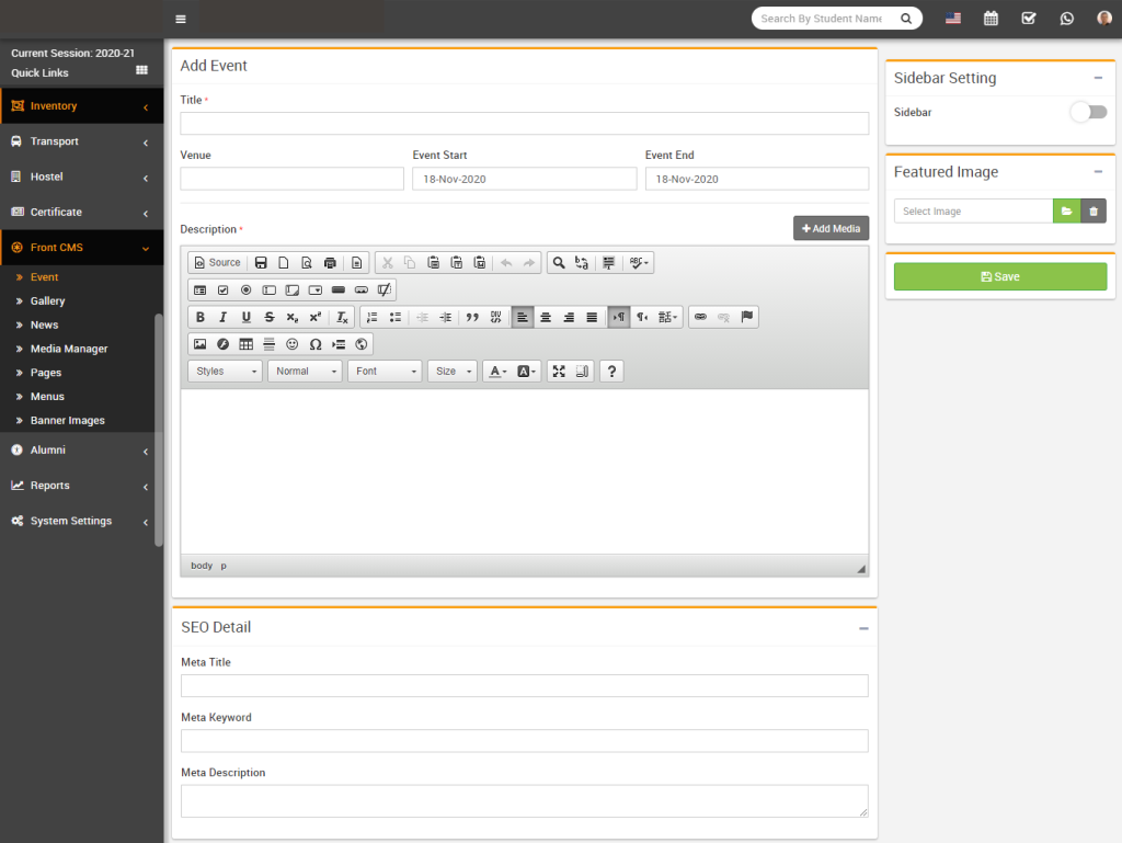 To add an event, go to Front CMS > Event and click the Add button located at the top-right corner of the event list. Enter the Event Title, Venue, Start Date, End Date, and Description. You can upload media, and also add SEO details such as Meta Title, Meta Keywords, and Meta Description. Choose whether to show or hide the Sidebar, and upload a Featured Image (if needed, the featured image can be deleted by clicking the Delete button). Finally, click Save to create the event.