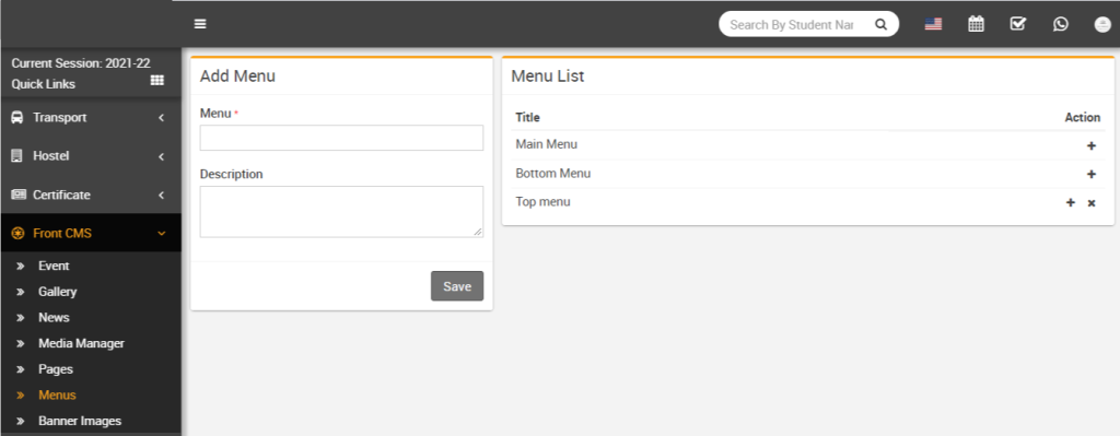 To create a menu in FiNIMS, go to Front CMS > Menus. By default, two menus are already available – Main Menu and Bottom Menu. To add a new menu, enter the Menu Name and Description, then click the Save button. The newly added menu will appear in the Menu List on the right side of the page.