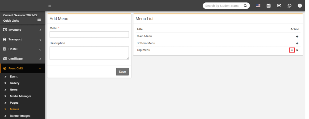 To add menu item click on Add (+) icon present at Action column in the menu list, at click of this icon Add Menu Item page will be open.