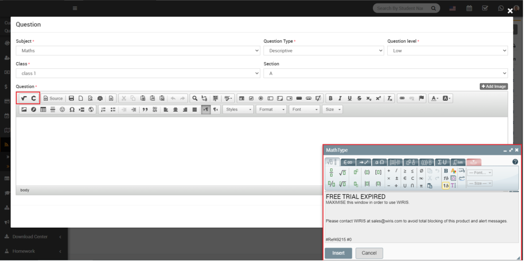 Note: The MathType plugin is a premium tool. In the Institute Management System, you can search records by selecting details such as class, section, subject, question type, and question level. After entering the required information, the matching records will be displayed at the bottom of the page.