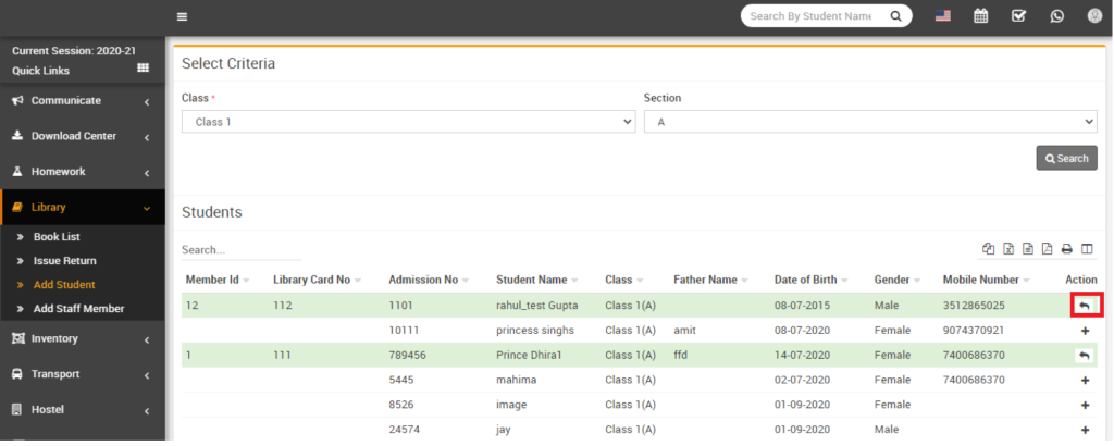 To add student as Library Member, go to Library > Add student then select the Class and Section and then click on the Search button to display student list. Now click on + icon from student’s list, at click of this icon a modal will open, here enter Library Card Number and then click on the Add button.