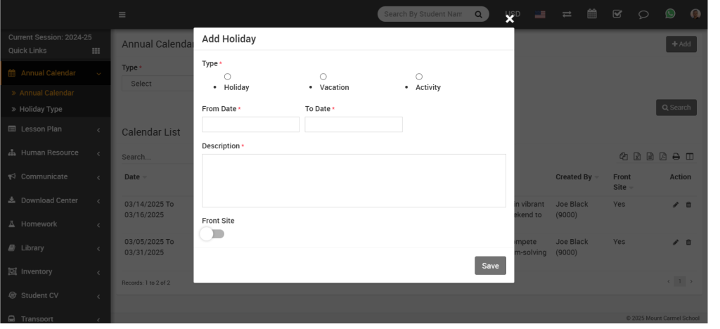 Note: Only those holidays will be shown on the front side where the front-side toggle button is enabled. Students and parents can see these holidays on their calendar once the toggle button is enabled.