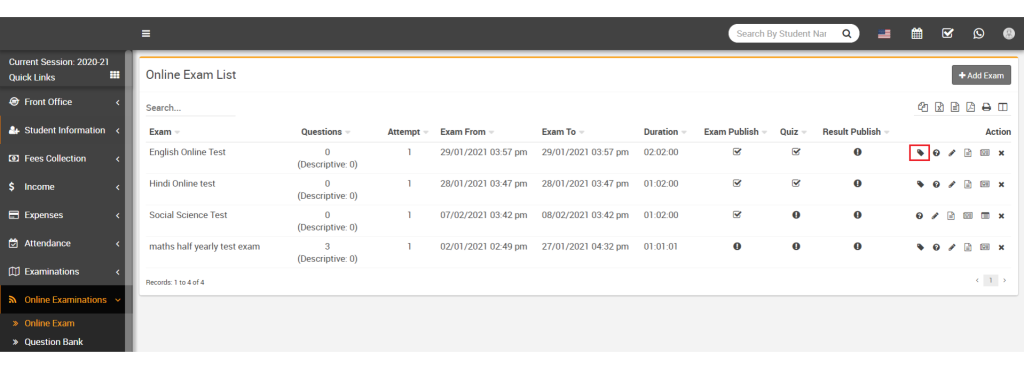 Here select Class and Section and then click on Search button. The list of assign online exam will be shown in this below of the page.