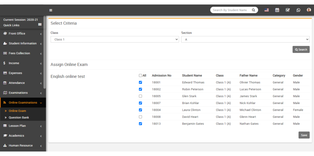 Now select student whom you want to Assign/Unassign the exam and then click on the Save button.
