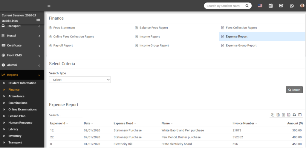 To view the Expense Report, go to Report > Finance > Expense Report. Select the Search Type and click the Search button. The list of matching records will appear at the bottom of the page.