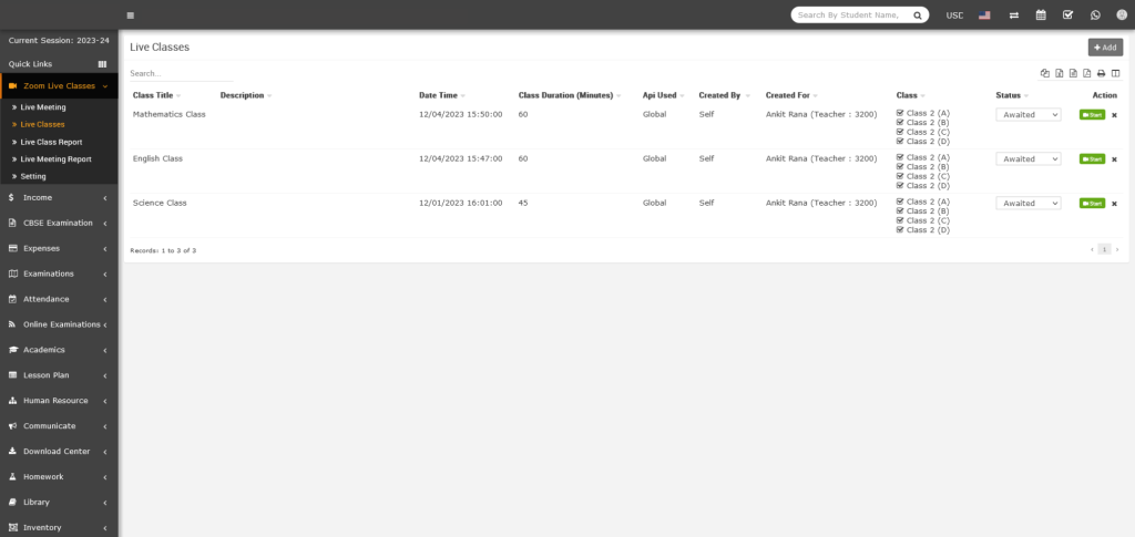 By default created Live Class status will be Awaited further you can set status of the class as Finished or Cancelled. For teacher, Start Class button and for students Join button will only show when status of Live Class is as Awaited.