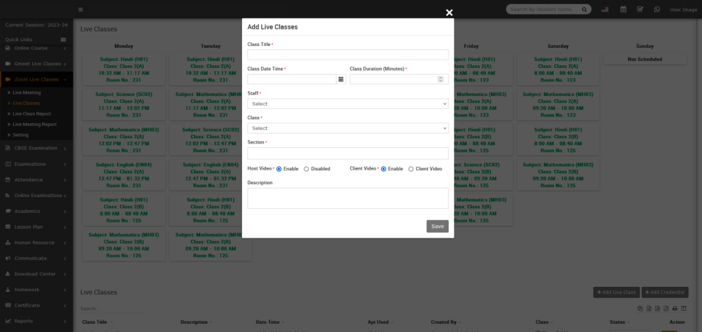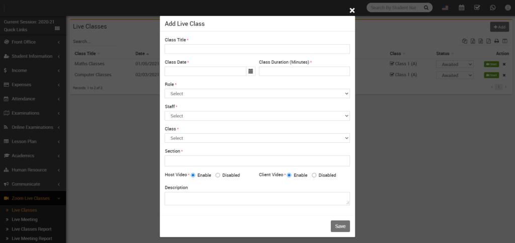 Here enter Class Title, Class Date, Class Duration (Minutes), Role, Staff (select teacher/staff who will take this class), Class, Section, Host Video, Client Video, Description details for live class then finally click on Save button.