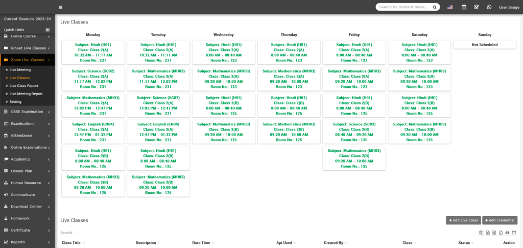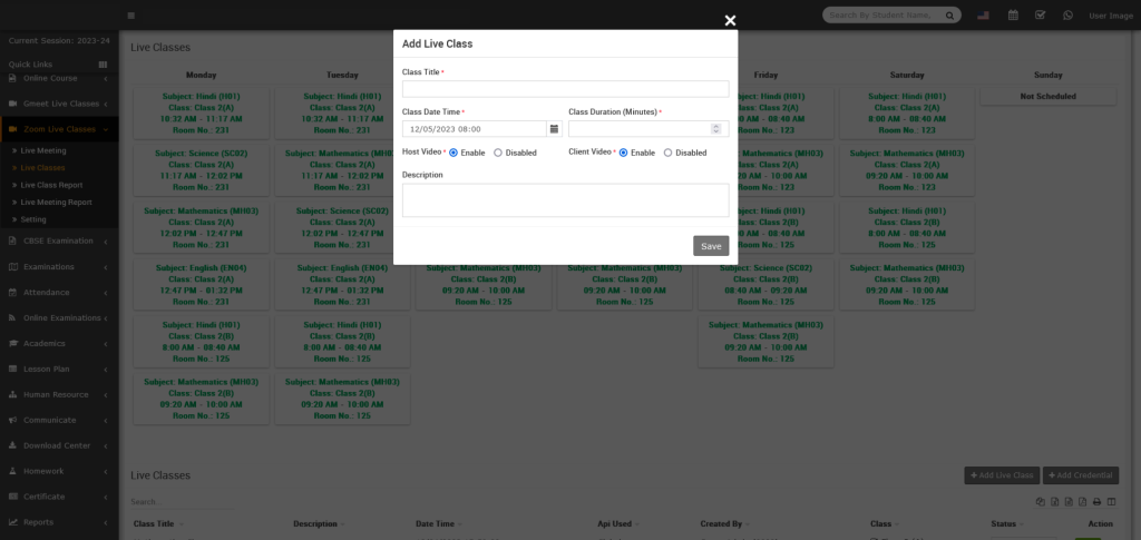 In Teacher login to create Live Class go to Zoom Live Classes > Live Classes, click on any period at timetable to open Add Live Class.