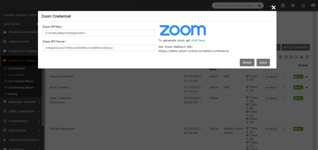 Teacher user can set their own zoom account api from Zoom Live Class > Live Classes > Add Credential, here enter Zoom API Key and Zoom API Secret details then click on Save button.