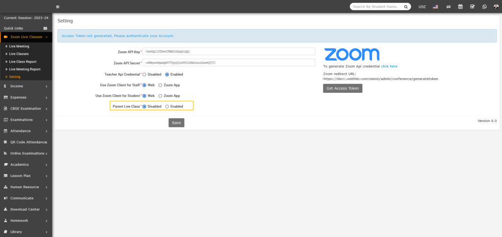 To enabled and disabled the parent from the zoom live classes, Go to the Zoom Live Classes > Setting.