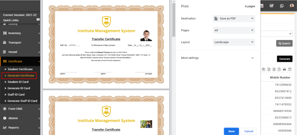 Now select student for generate certificate and click on Generate button present at right side in the student list, at click of this button certificate will be open.