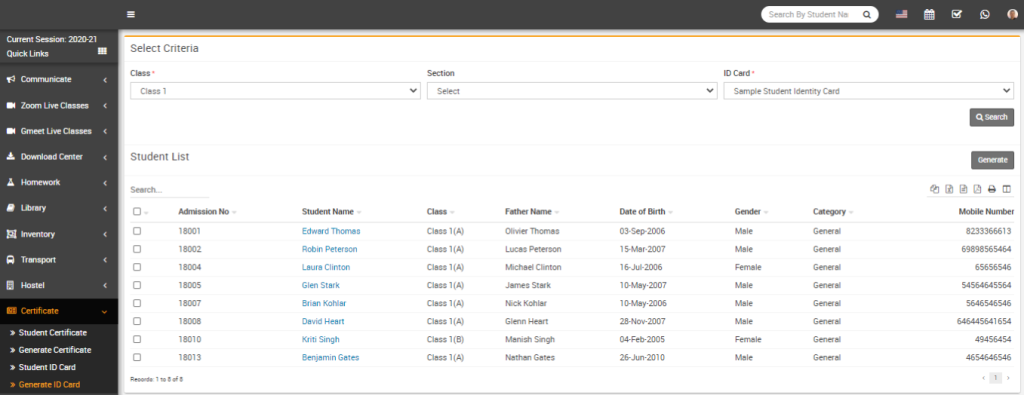 To generate ID card, go to Certificate > Generate ID Card then select Class, Section and ID Card and then click on Search button. The list of Student will be shown in the below of the page.