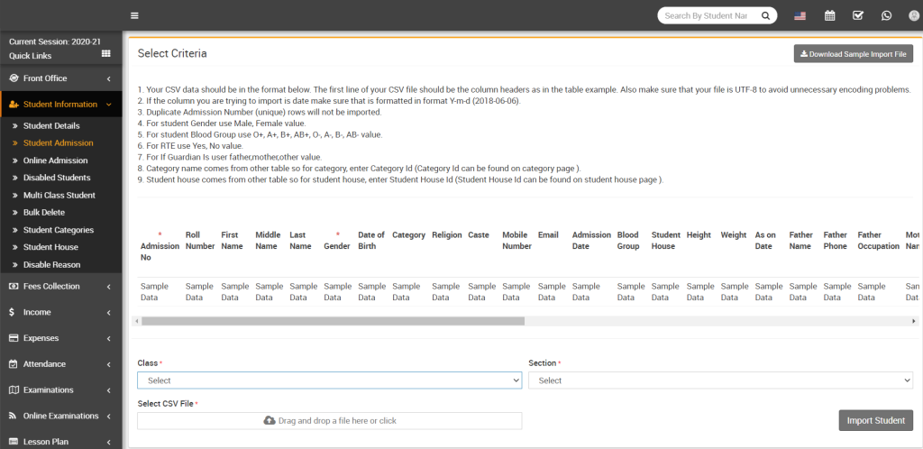 You have to follow all the necessary instructions given here to create CSV file. Here you can also add multiple students at the same time for this, you have to create a CSV file format. You can also download the sample file from top right corner by clicking on Download Sample Import File button.