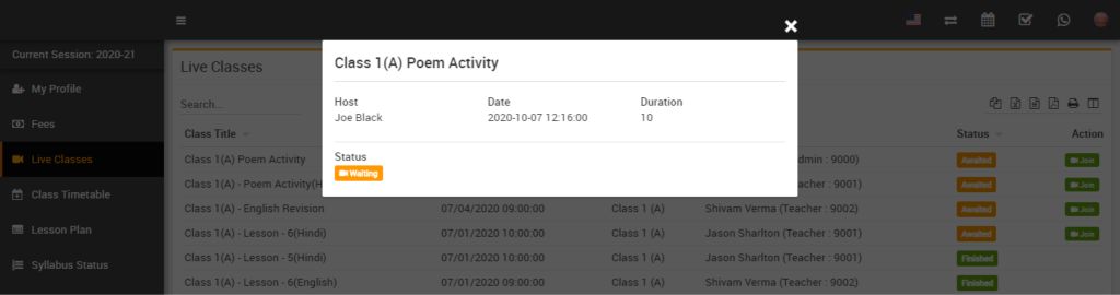 To join Live Class, login from your Student / Parent panel then from left sidebar menu click on Zoom Live Classes link. At Live Classes page you will see available Live Classes list here click on Join button. After click on Join button a modal opens with information Host , Date, Duration and Status. If Live Classes is not started then you will see status Waiting.