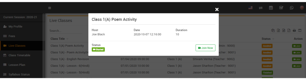 If live classes is started by teacher then you will see Join Now button in the bottom right corner of the modal. By clicking of Join Now button you will join the Zoom Live classes.