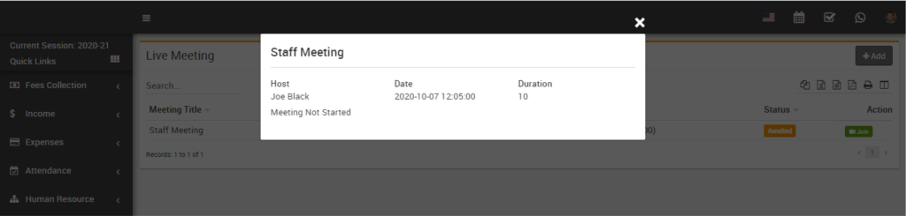 To join Live Meeting, login in to your account and go to Zoom Live Classes > Live Meeting, Here you will see available meetings to join. Now click on Join button. After clicking on Join button a modal opens with information like Host, Date, Duration and Status. If Meeting is not started you will see status “Meeting not started”.