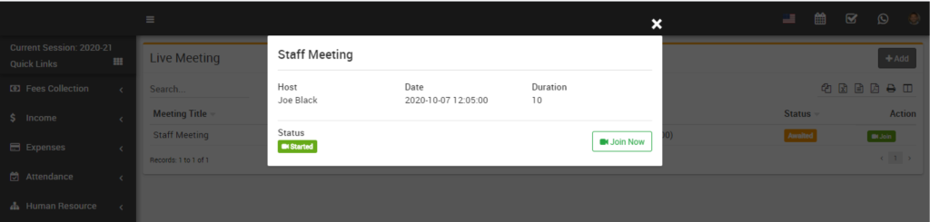If Meeting is started by admin then you will see Join Now button in the bottom right corner and Status “Started” on the bottom left corner of the modal. On click of Join Now button you will join the Live meeting.