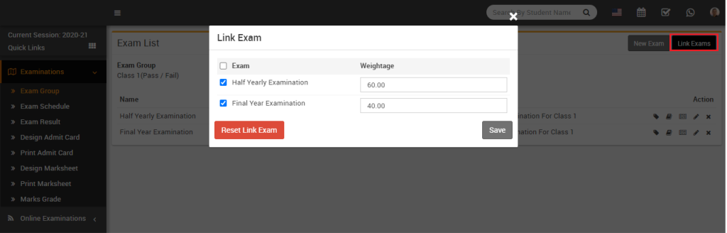 To link two exams and generate a consolidated result with the final exam, click on the Link Exam button available on the right side of the exam list page. Once you click this button, the Link Exam modal will open. Here, select the two types of examinations and enter the percentage to calculate the final exam result. If you want to reset the exam, click on the Reset Link Exam button, otherwise click on the Save button.