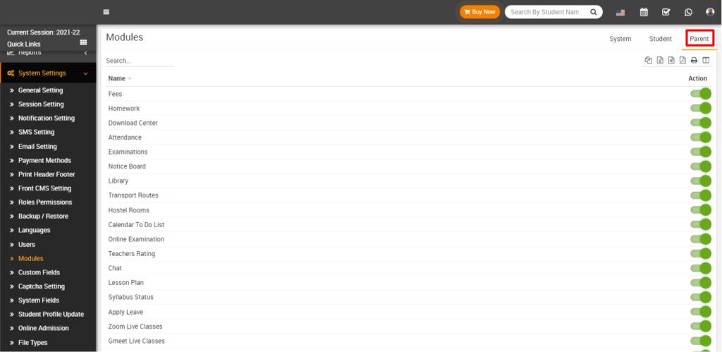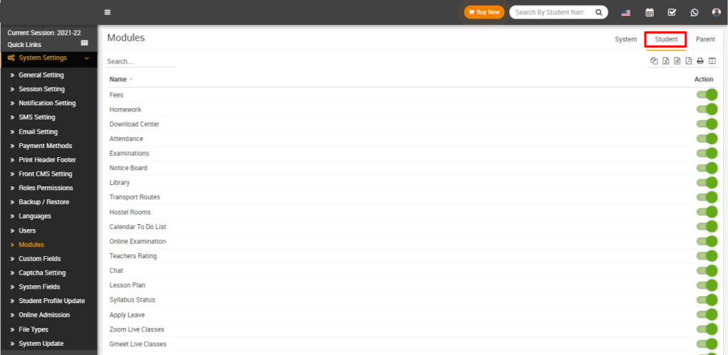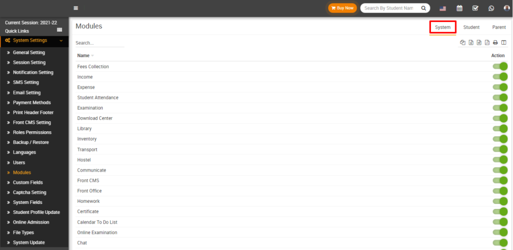 To manage modules in FiNIMS, navigate to System Settings > Modules. On this page, you can view all currently enabled modules. If you disable a module, it will immediately be hidden from the Admin, Student, and Parent panels. To enable or disable a module, simply click the toggle button in the Action column.