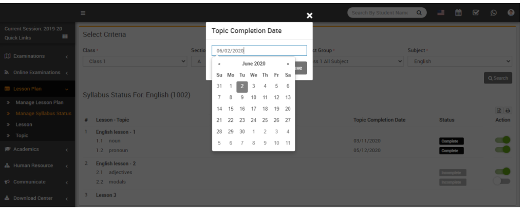 Go to Lesson Plan > Manage Syllabus Status. Select the Class, Section, Subject Group, and Subject, then click on the Search button. All the available lessons and topics for that subject will be displayed.