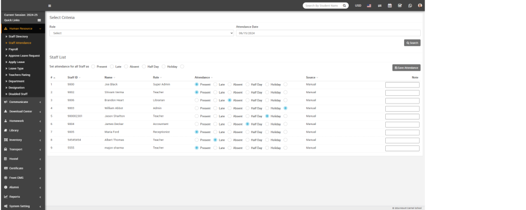 First, we proceed with Manual Type Staff Attendance. Simply select the attendance of the staff of the current date, here you can see Set attendance for all staff as option is available, using this option you can mark the all staff attendance at single click, if you want to mark the attendance as Present for the all staff, simply click on Present checkbox then click on Save Attendance button showing at the right side, all staff attendance will be mark as present at the same time and in Source column will show the type of Attendance as here we marked Manual Attendance. this process would be same for Late, Absent, Half Day, Holiday