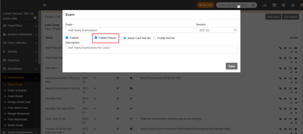 To publish examination results, after entering student exam marks, click on the Edit Exam button. Here, enable the Publish Result option and then save it. Once saved, the created exam result will be published and will be visible to students on the Exam Result page.