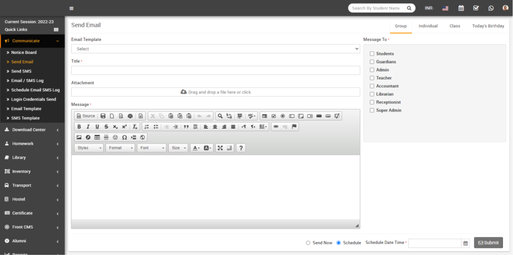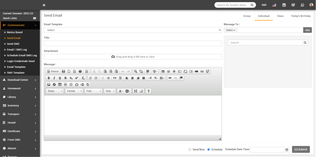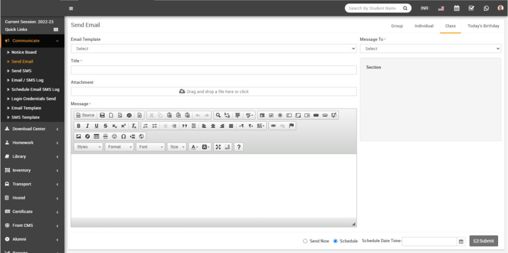 To send an email, navigate to Communicate > Send Email. On this page, four tabs are available at the top right corner – Group, Individual, Class, and Today’s Birthday. You can select any of these based on the type of recipients you want to send the email to.