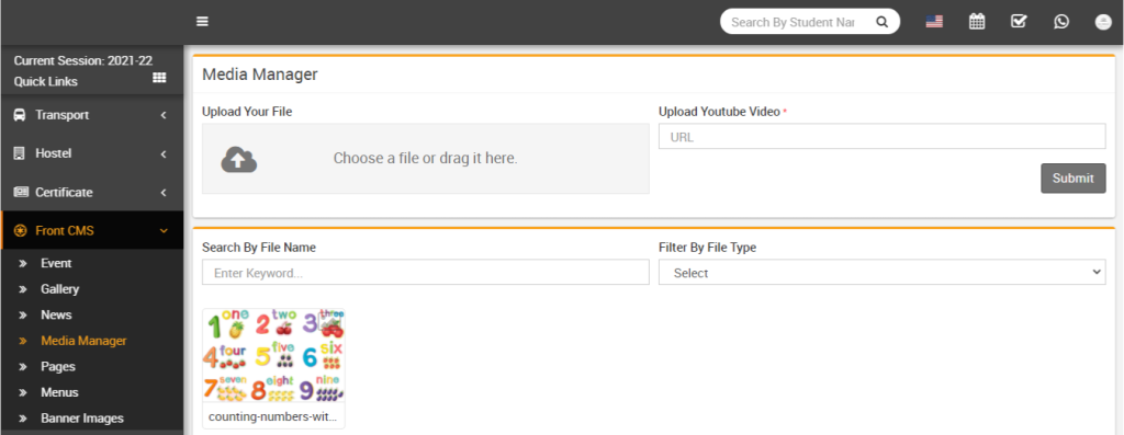 To upload a file, go to Front CMS > Media Manager. You can either select a file or drag it into the Upload Your File area. If you want to add a YouTube video, simply enter its URL and click the Submit button. Media files can be searched by typing a keyword in the Search by File Name field, or by filtering files based on their type (such as video, text, zip, rar, etc.).
