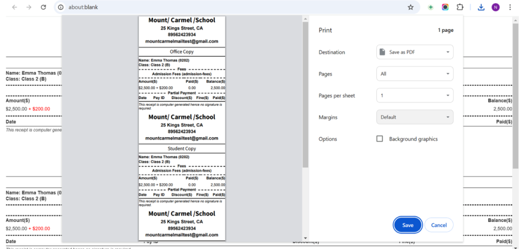 At the top of the page, you will find the Thermal Print Enabled/Disabled option. By enabling it, the fee receipts in FiNIMS will be generated using thermal printing. After making the changes, click the Save button at the bottom to apply your settings.