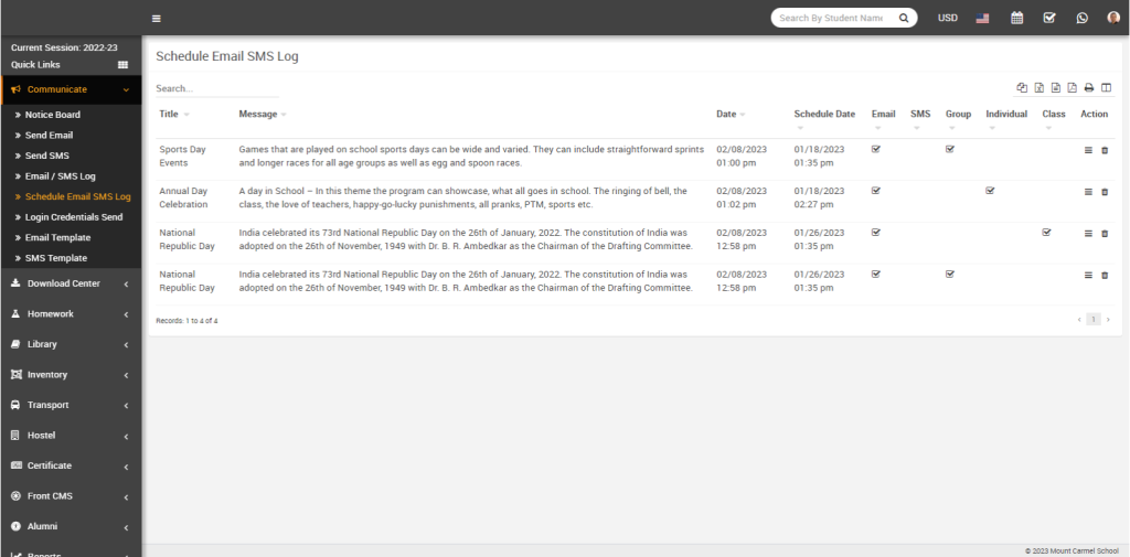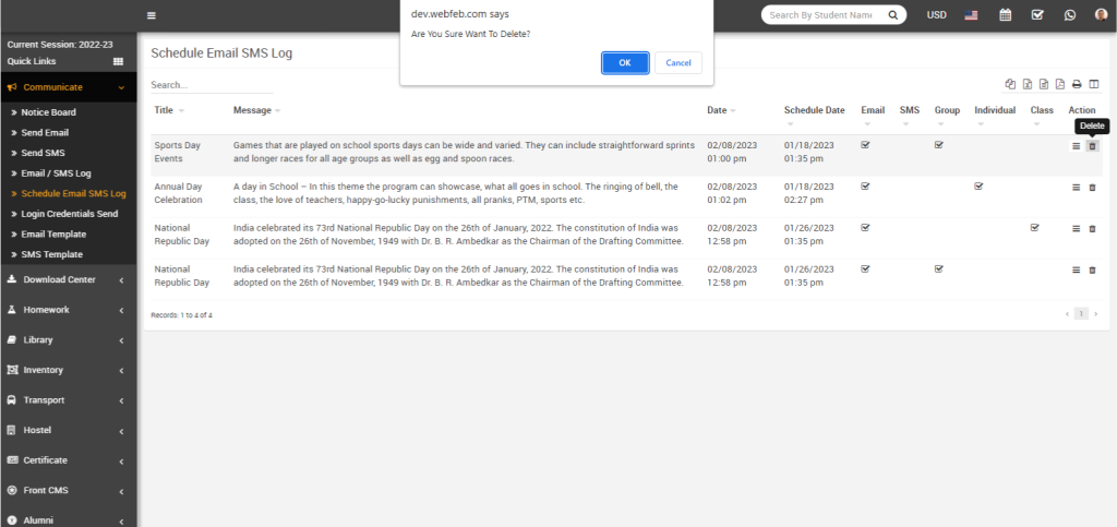 To Delete them, simply click on the Delete icon in the Action column, and your schedule email sms will be successfully deleted.