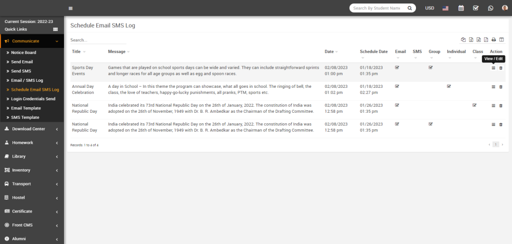 In the Action column, you can view, edit, or delete the scheduled email and SMS logs. Click on the “View” option in the action column to view or edit.