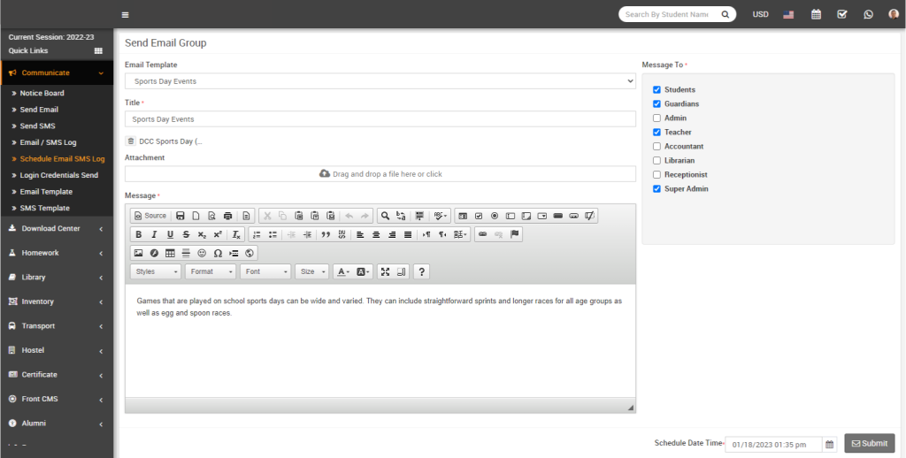 Here you can edit the Schedule Email and SMS Log; click on Schedule Date and Time to edit a date and time; then click on the Submit button. Your schedule email sms will be updated.